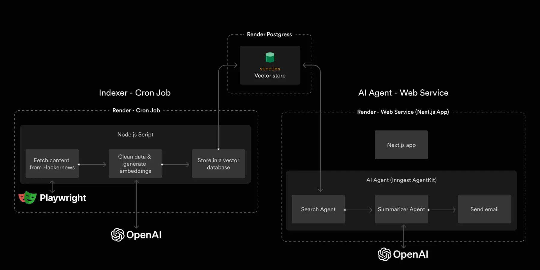 2. Indexer cron job: Periodically fetches new Hacker News stories based on topics you're interested in, generates embeddings of the content, and stores the data in the database.