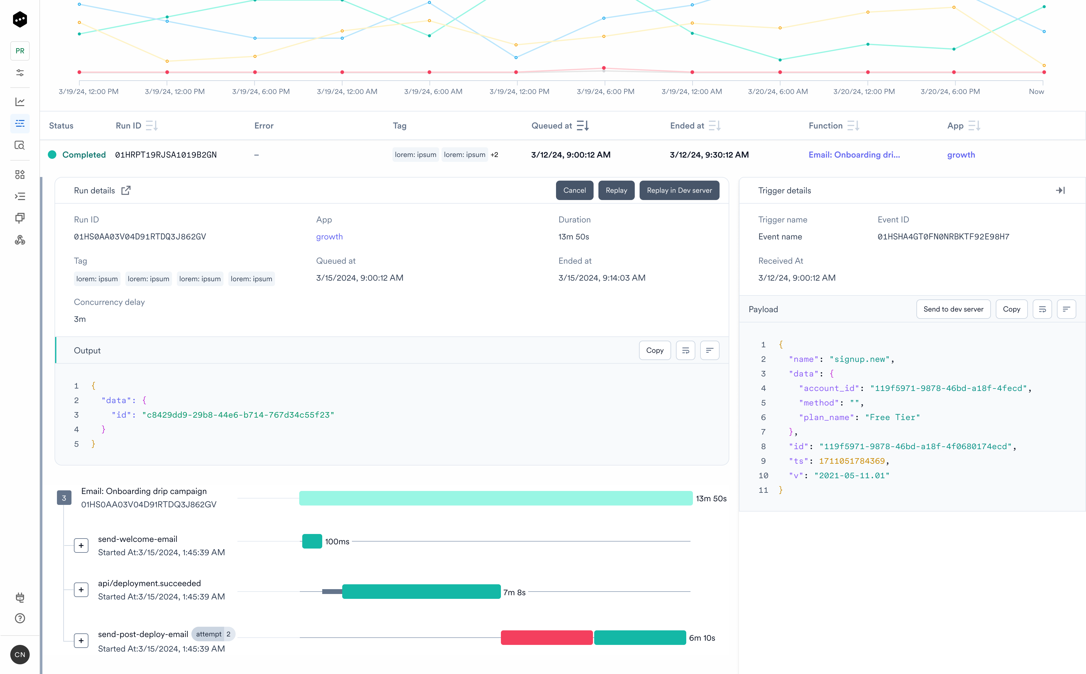 4. Monitoring and efficient recovery: Inngest's dashboard offers deep insights into task execution, enabling developers to monitor, troubleshoot, and recover from failed runs. Especially helpful here are features such as Replay and detailed function tracking, which further enhance system reliability.